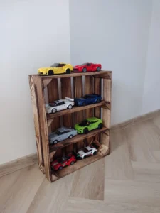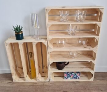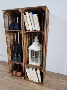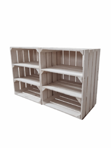 • Wooden crates with a single shelf – available in white and white with a burned-wood effect, combining simplicity with vintage charm.