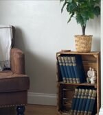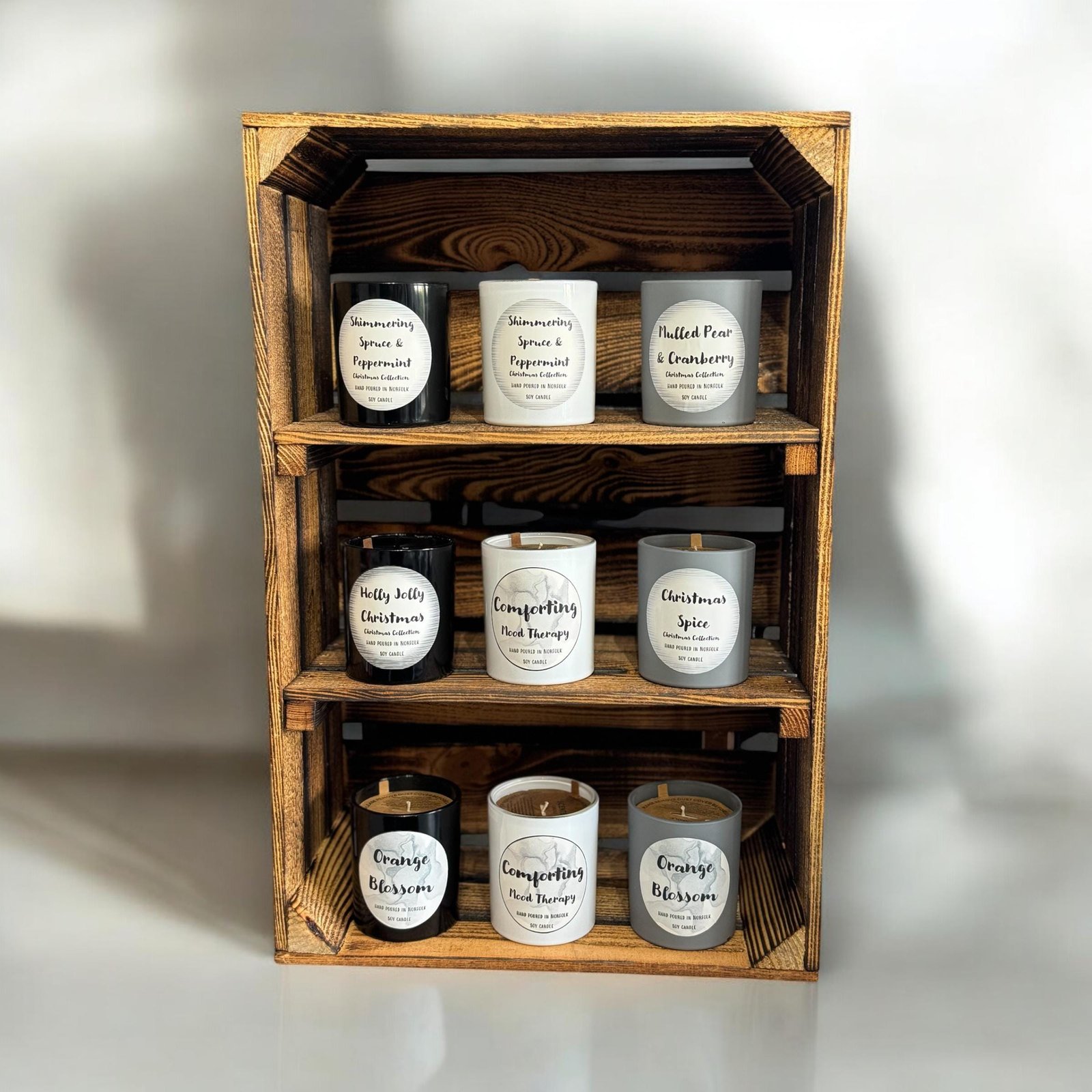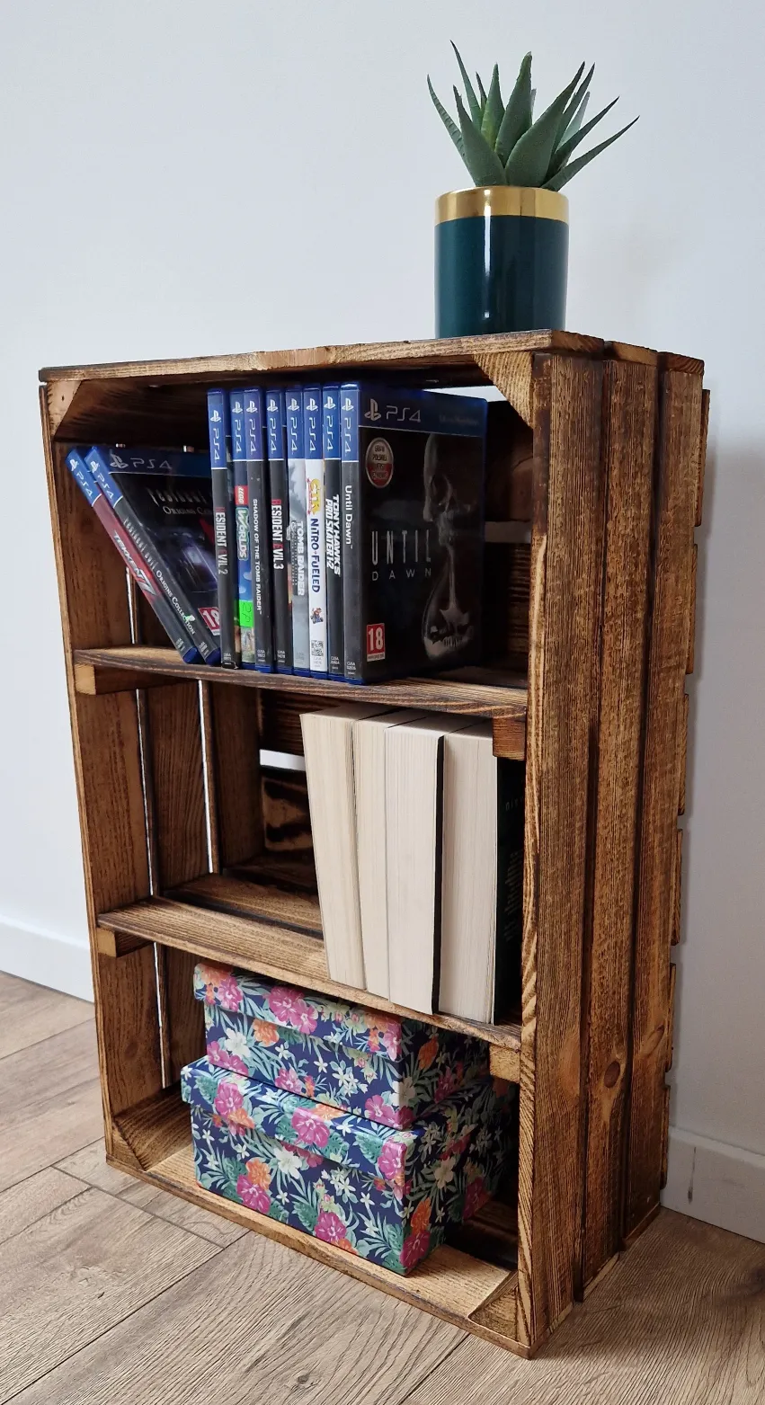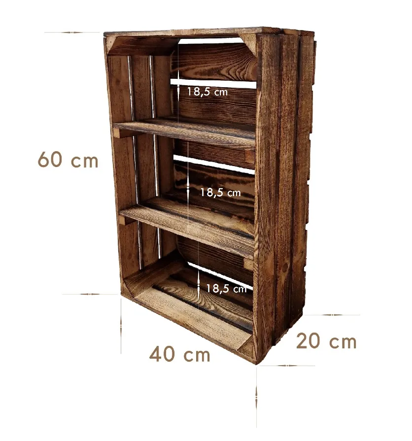 • Handcrafted wooden shelf crates, each piece has a unique burnt finish