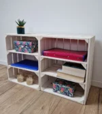 • Stylish wooden crates with shelves – available in grey, white, and white with a burned-wood effect for a unique, elegant touch.